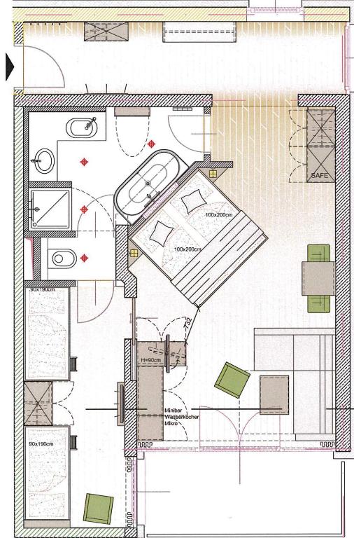 WC, Badezimmer mit Dusche und Badewanne, eingebauter Babybadewanne, Wickeltisch, Balkon, SAT-TV, Radio, Kühlschrank, Mikrowelle, Wasserkocher, Safe, Badetücher, Handtücher. Abweichungen in Ausstattung und Einrichtung zu den gezeigten Bildern sind möglich.